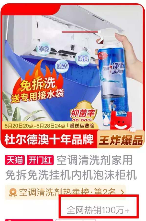 今儿这款空调清洗剂也是它家的明星产品,因为清洁效果出众,在某宝热销100万+。