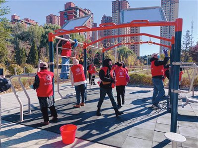 志愿者们身着红马甲,自备手套,拿起抹布、夹子、垃圾袋等清洁工具,分工协作、相互配合,清死角、扫盲区、治顽疾,对背街小巷和小区内积存的废弃杂物、生活垃圾、杂草等进行清理,对全民健身器械进行擦拭,有序整治各种“脏乱差”现象,为共建美好家园贡献力量。