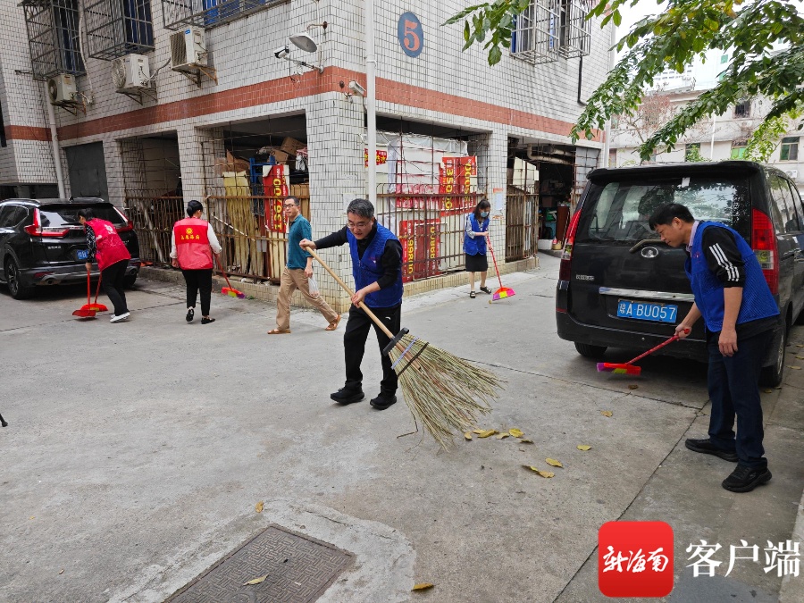 海南省妇女联合会干部职工在龙舌坡宿舍区开展周末大扫除活动。
