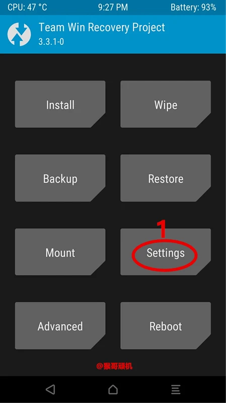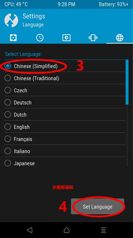 答:其实很简单的,TWRP官方默认就是英文的,需要设置才能变成简体中文的(按照1-4步设置即可)