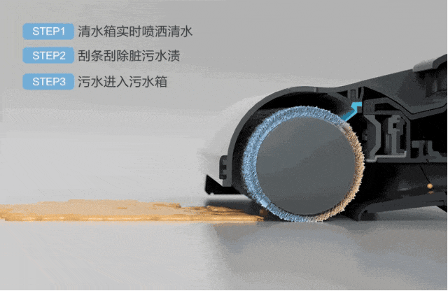 工作原理也很简单,开启工作后,清水箱中的水会自动润湿滚刷,高频运转的滚刷与强大的吸力协同工作,将脏垃圾一扫而空,同时拖净地板,实现吸拖洗三合一的高*效清洁。