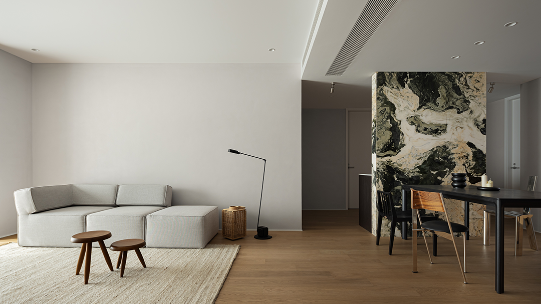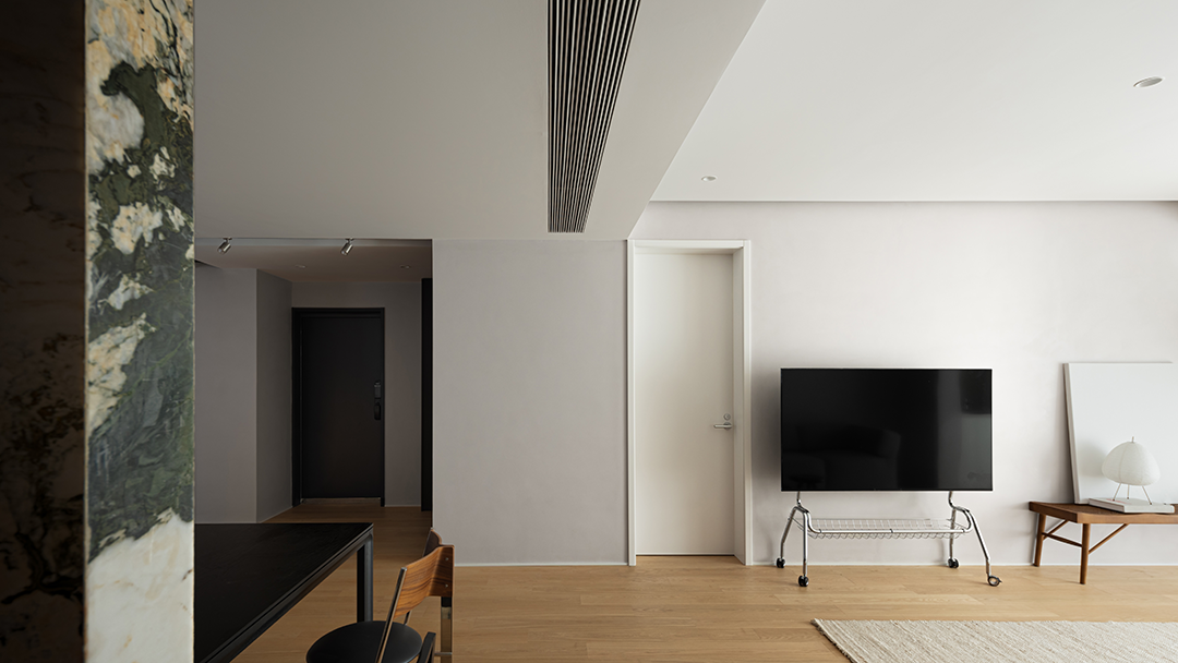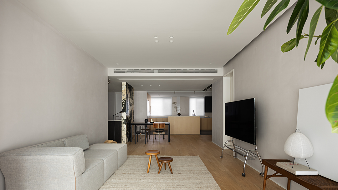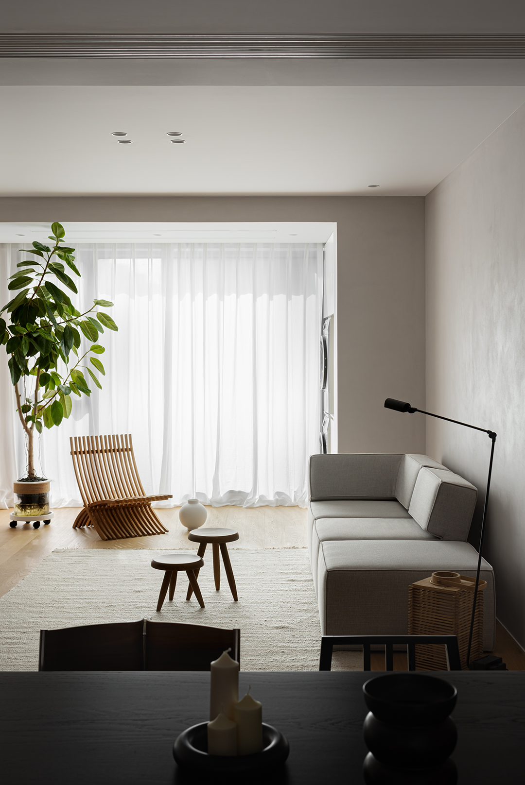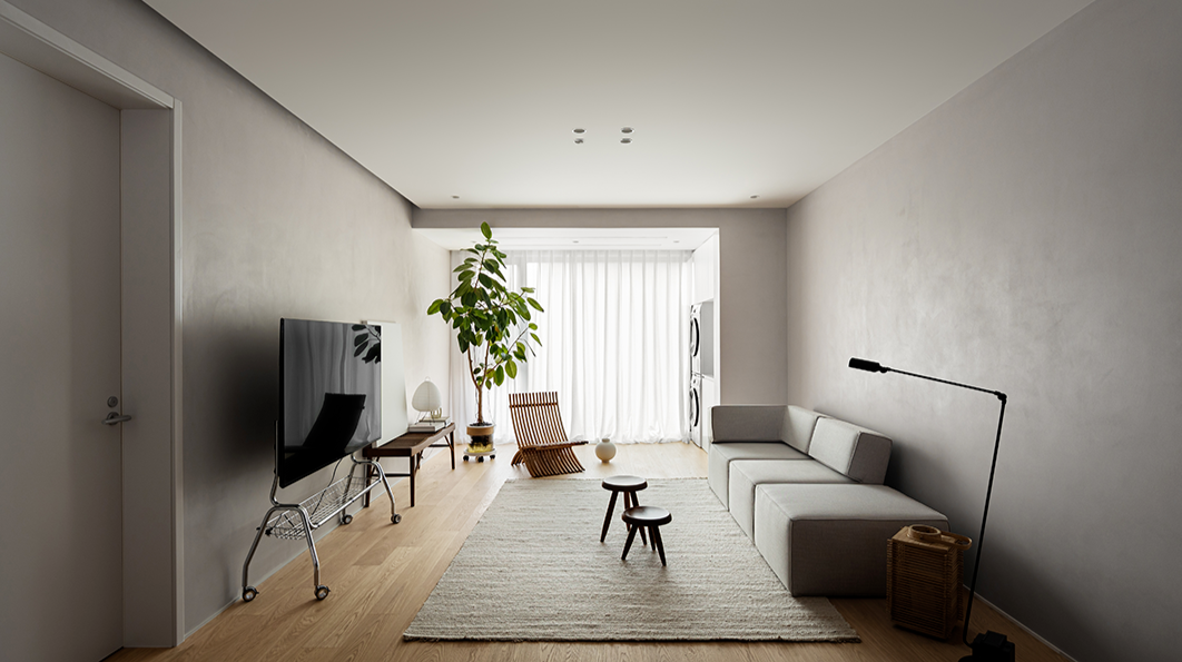 微水泥的素白墙面是住宅的底色,使不算大的空间有了更多想像力。全开放式的设计辅以温馨的灯光、温润的木地板,营造出一个松弛感十足的空间。