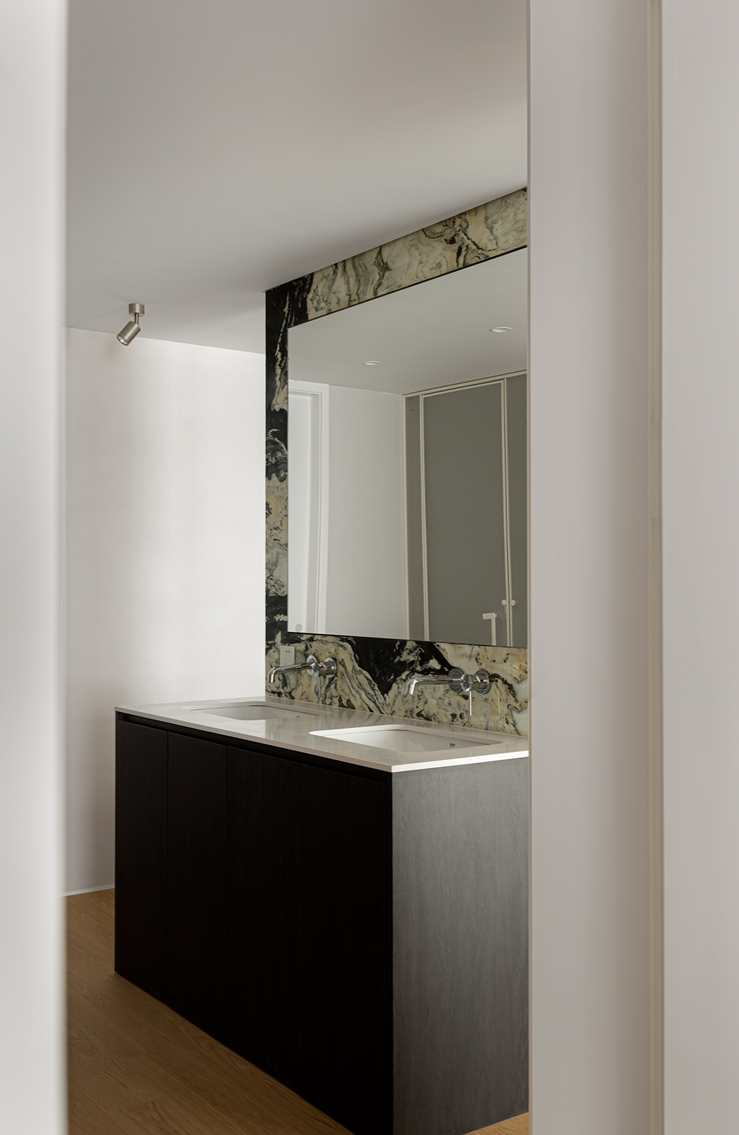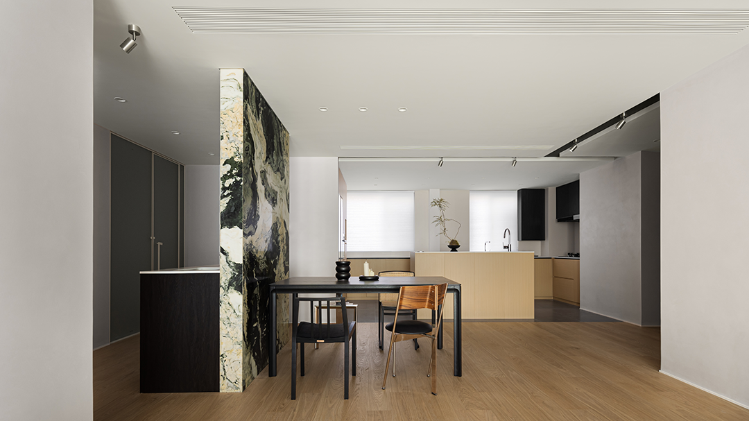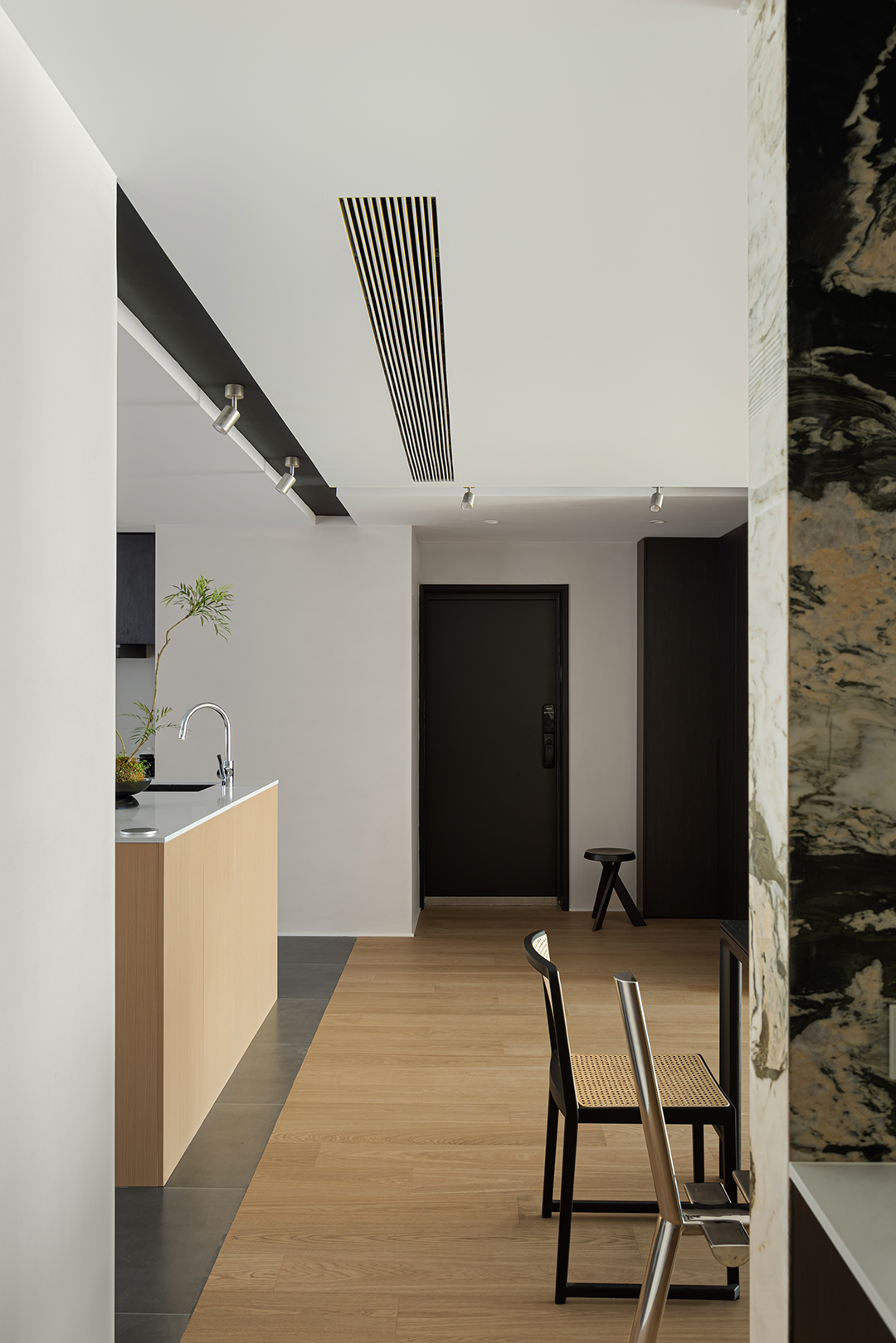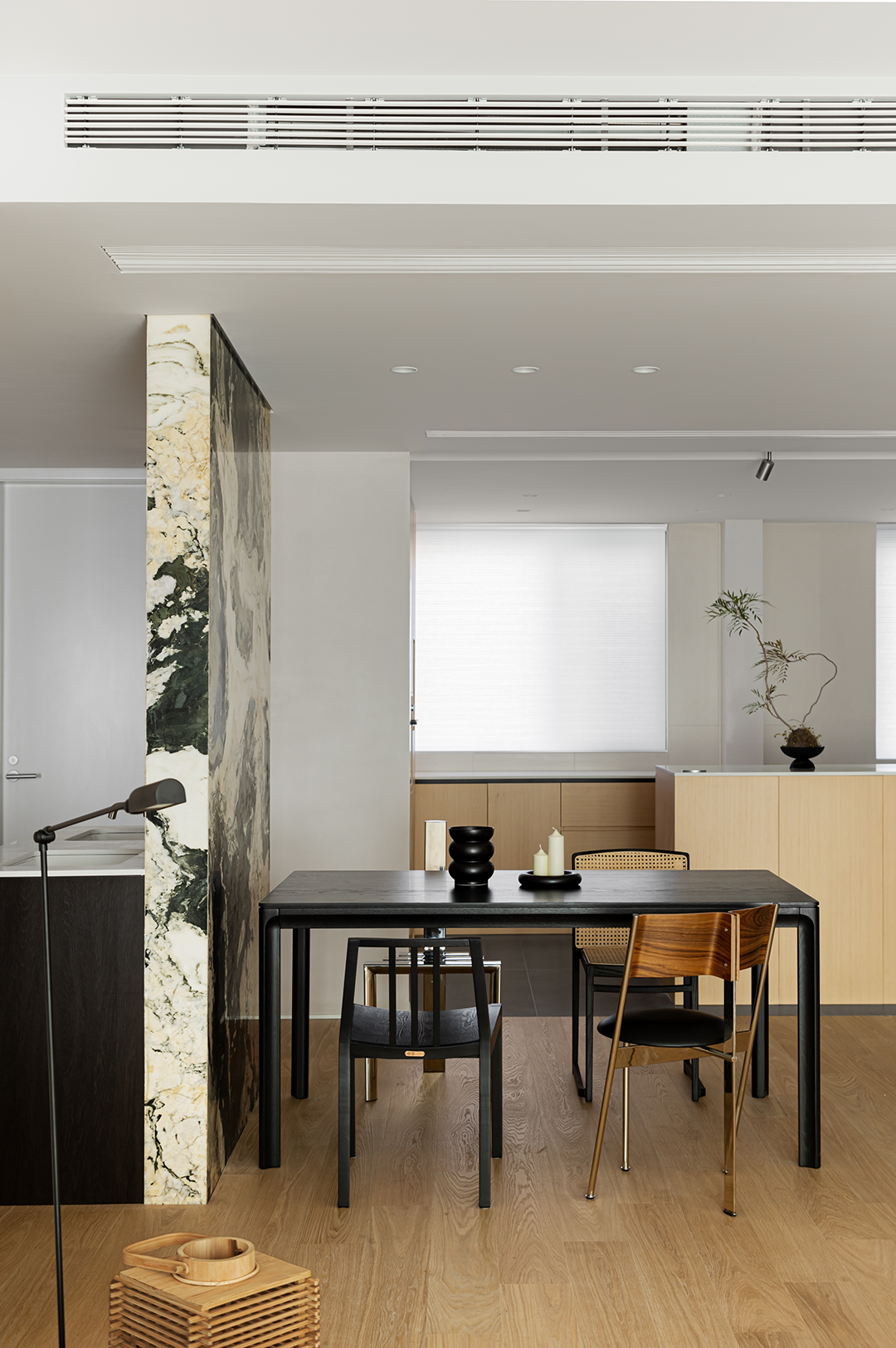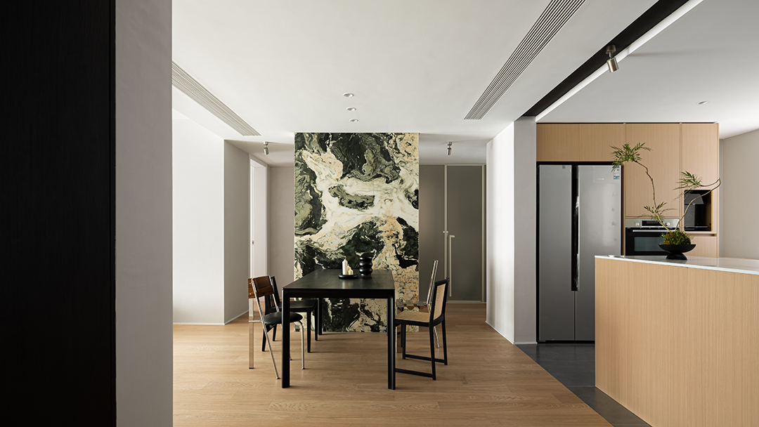 靠近一侧深绿色石纹背景板,既是动区与静区的隔断,也是空间写意的装饰。深邃的绿与细腻的白,保证了质感的同时增添了一抹灵动雅趣。