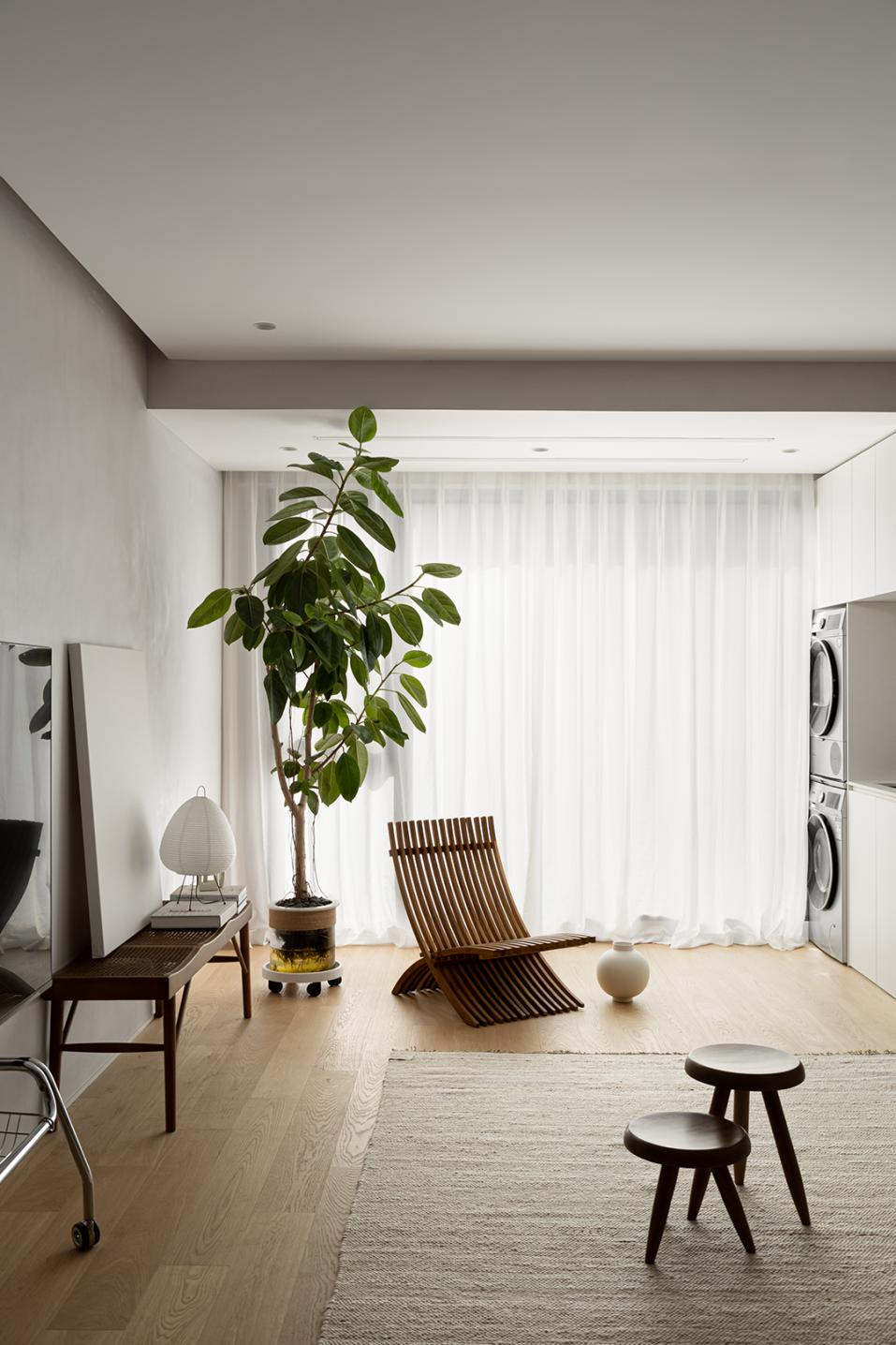 阳台上,一侧是实用的储物柜+洗衣烘干机,轻松收纳行李箱等大件物品;另一侧,则是屋主挚爱的休闲区,在阳光最为明媚的窗边,听音乐、赏景,生活的美好尽在此刻。