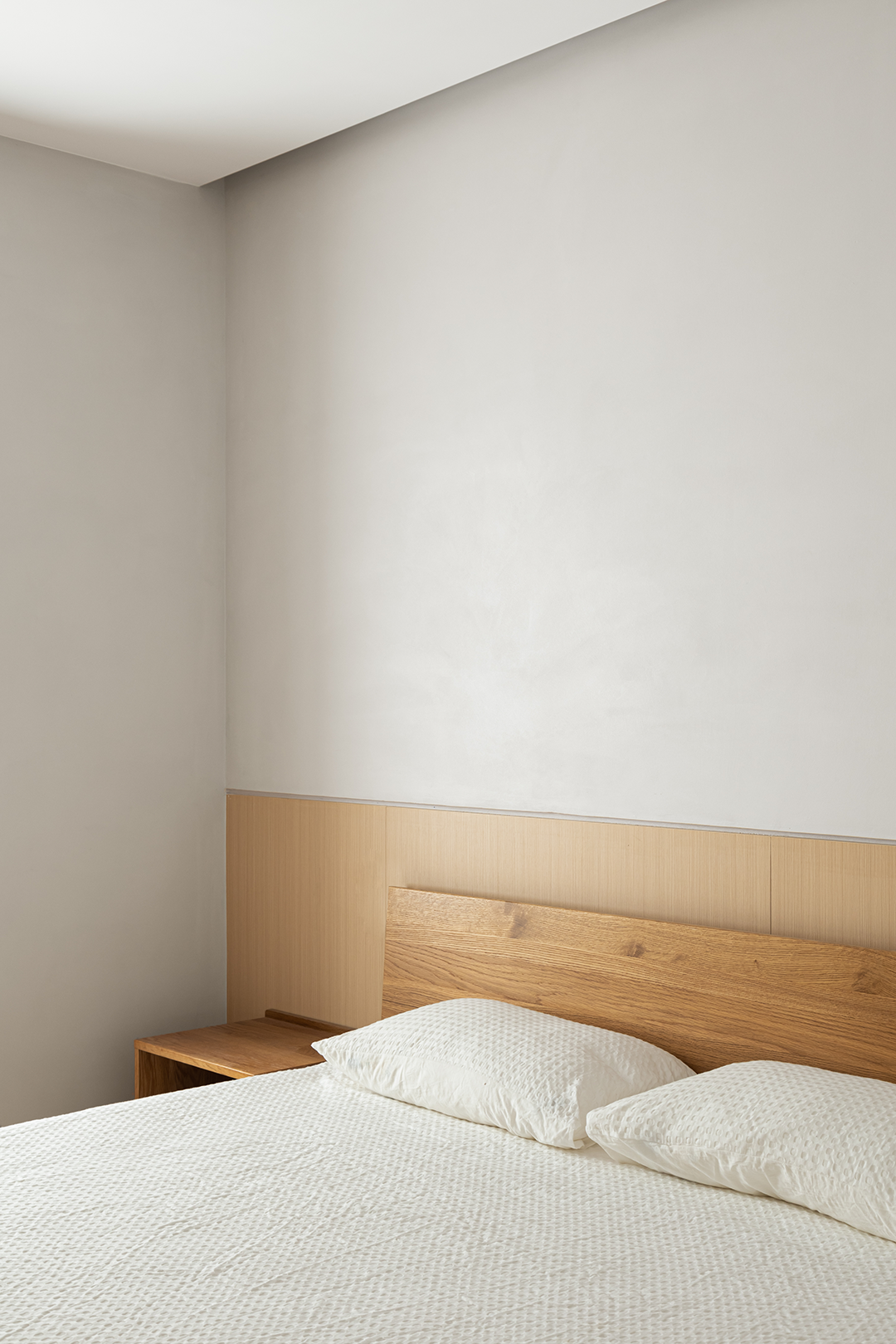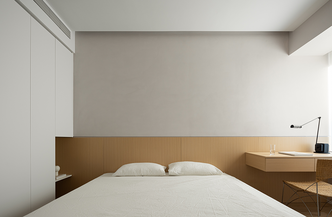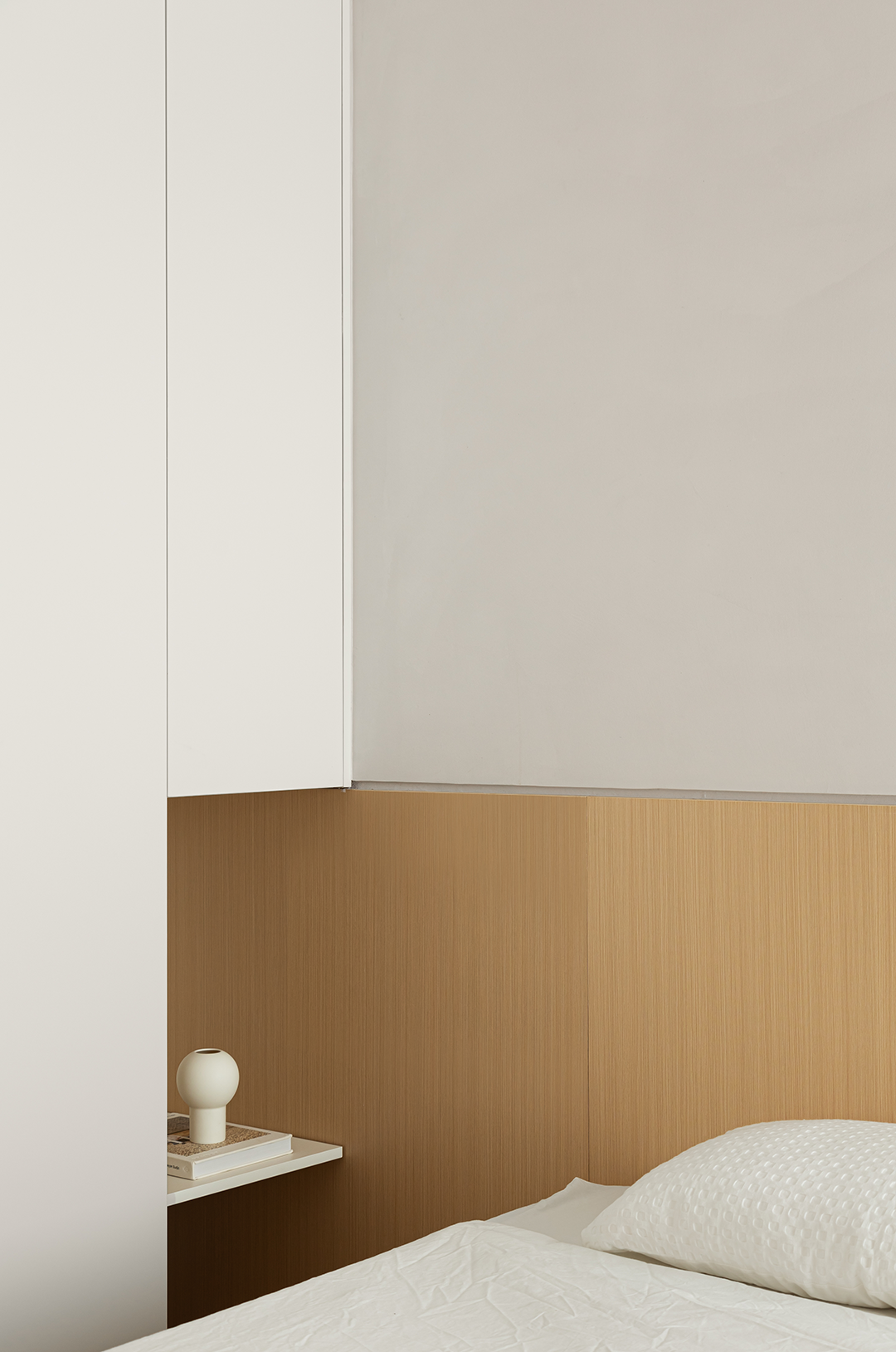 卧室2——床头背景墙用木饰面设计高墙裙,让空间的线条感得以延伸;床侧定制一整排的柜体,足够的收纳是家久住不乱的底气。