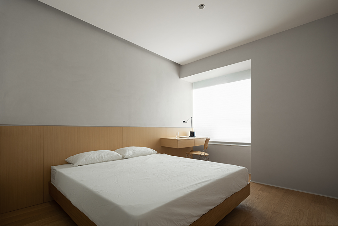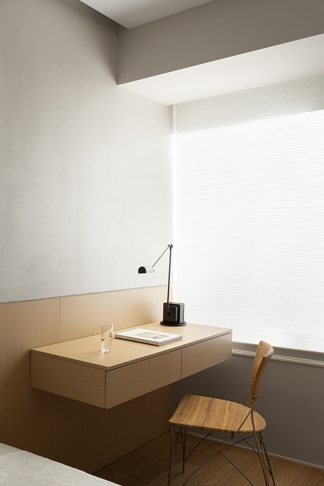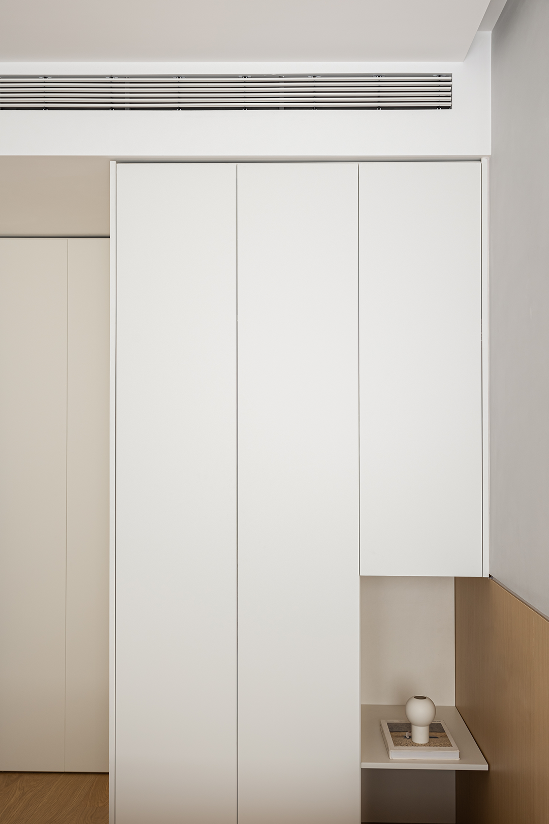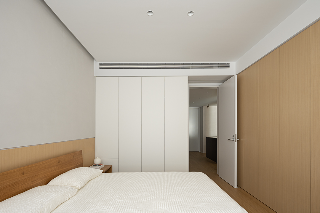 卧室2——床头背景墙用木饰面设计高墙裙,让空间的线条感得以延伸;床侧定制一整排的柜体,足够的收纳是家久住不乱的底气。