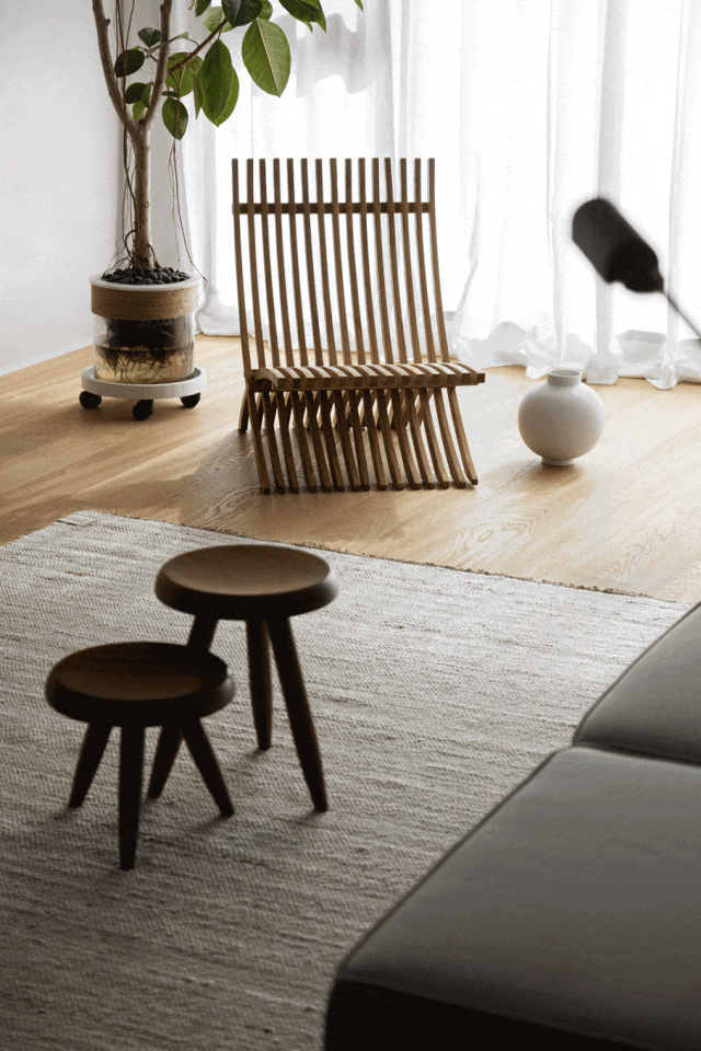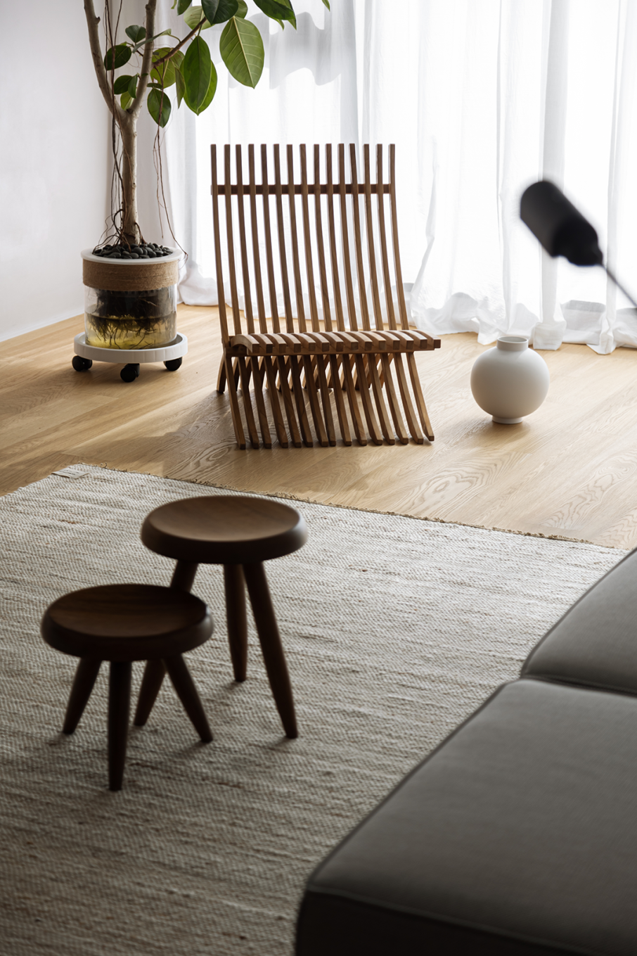 简约的家具搭配移动电视,让互动更加纯粹,观影体验更加灵活多变。一把木质交叉座椅,与一旁的白瓷花瓶,使空间仿佛多了一丝禅意。