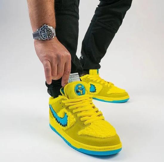 这双 Grateful Dead 和 SB Dunk 的重磅联名,明亮黄搭配蓝色,也受到鞋头们的追捧。