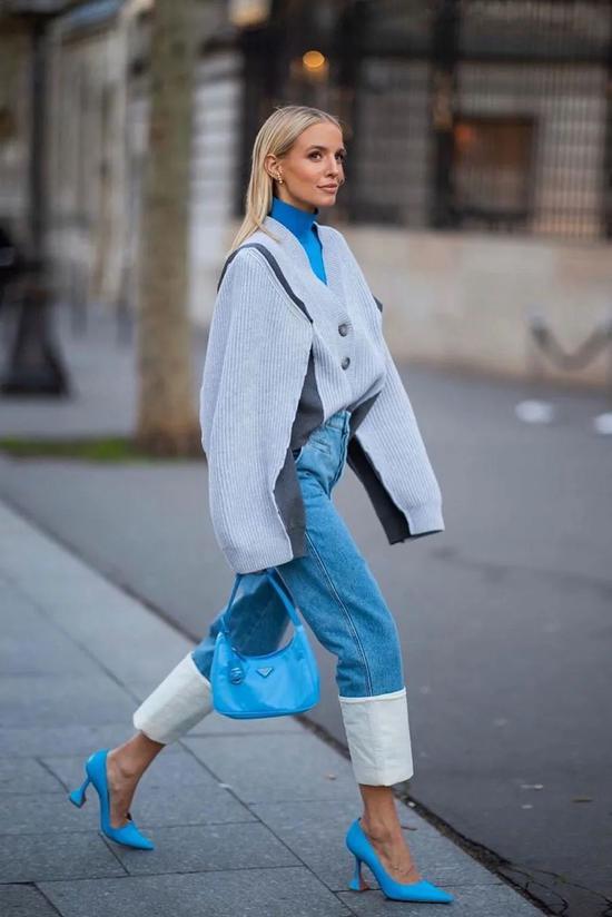 蓝色高领打底、高跟鞋、包包搭配灰色开衫,看上去极其的舒适。