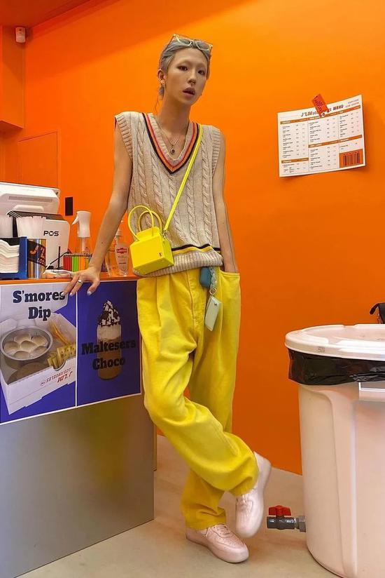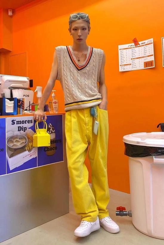 韩国无性别穿搭博主 Hyeokjin Eum,用亮黄色的下装搭配无袖针织毛衣,简单的搭配却十分抓人眼球。