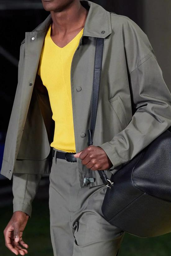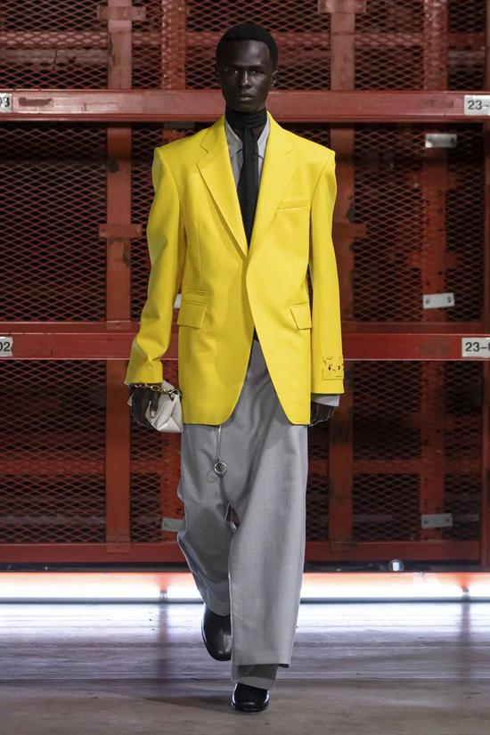 Alvatore Ferragamo 2021 春夏系列则采用了和 Off-White 相反的方向,把明亮灰搭配在了灰色夹克的里面,用黄色提亮整套 LOOK,视觉效果就非常好。