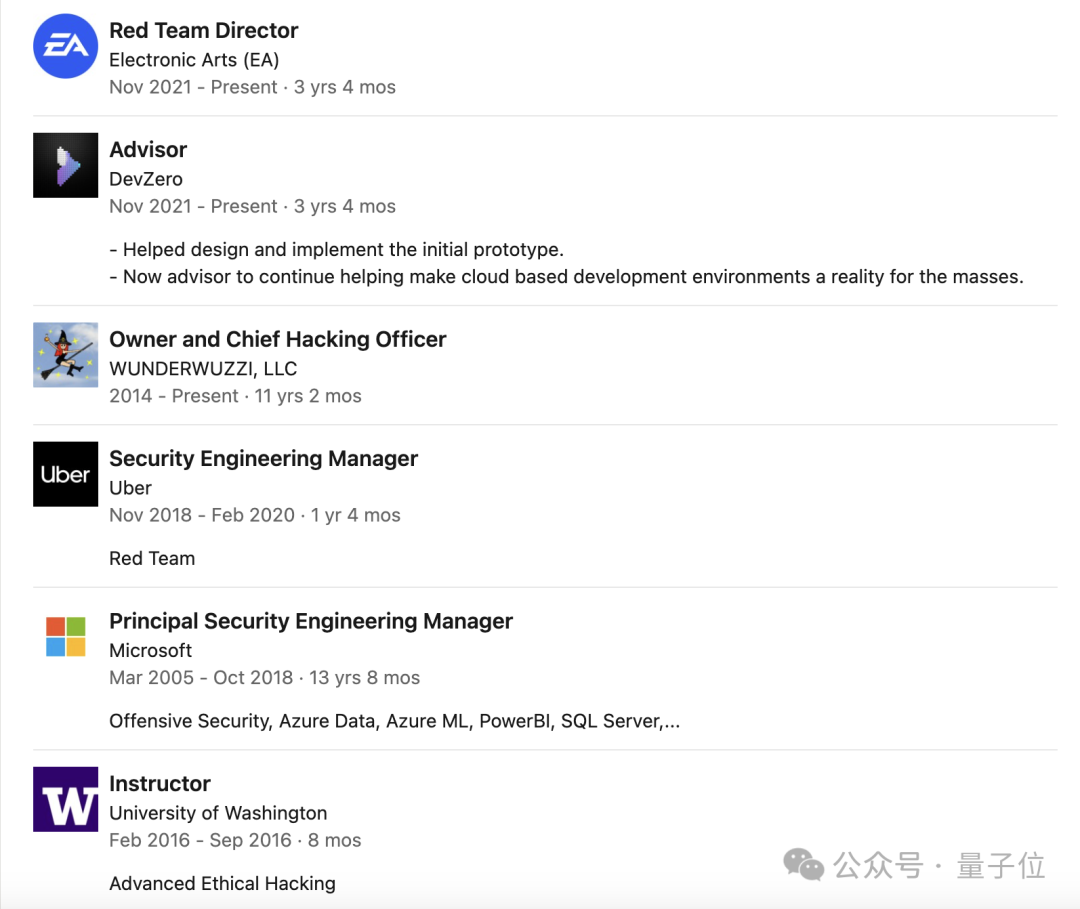其间,雷哥还在华盛顿大学当过Instructor,并在微软和Uber先后从事过和安全相关的工作,2021年起还给担任了EA的红队负责人。