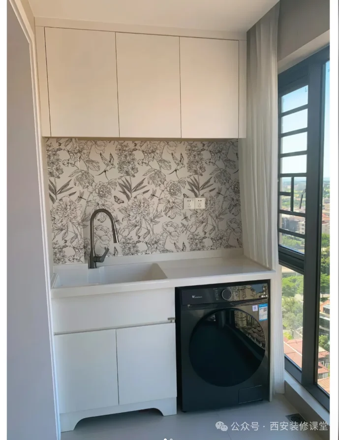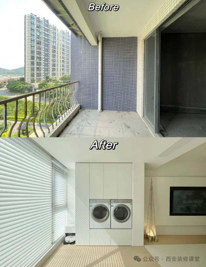 有人偏不用老传统,打通阳台,不做墙砖不做哑口套,钱省下来直接烘干机买回来![]()
