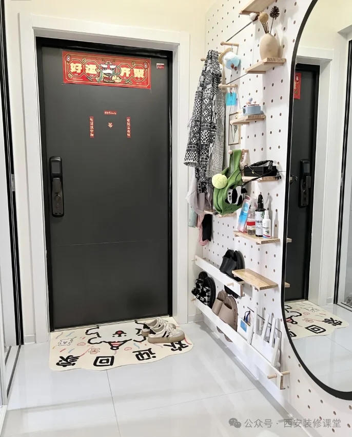 就两人居住,平时穿的鞋子就两双,而多余的都放到了别的收纳地方,干脆门口就不要鞋柜,采用洞洞板设计满足一些随手储物,门口空间还变大了![]()