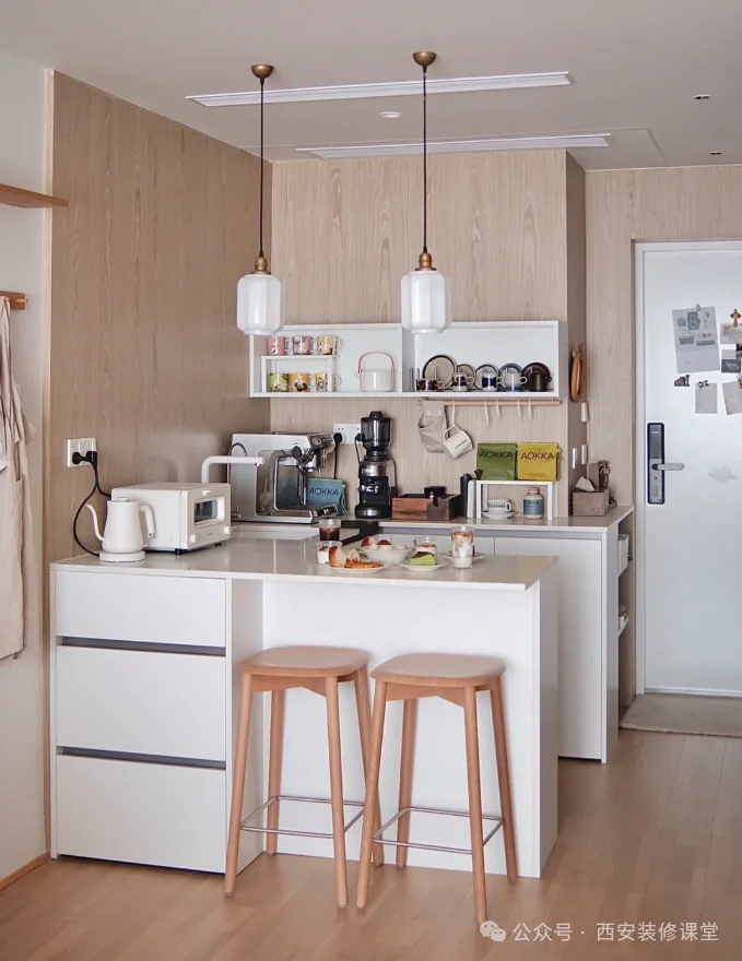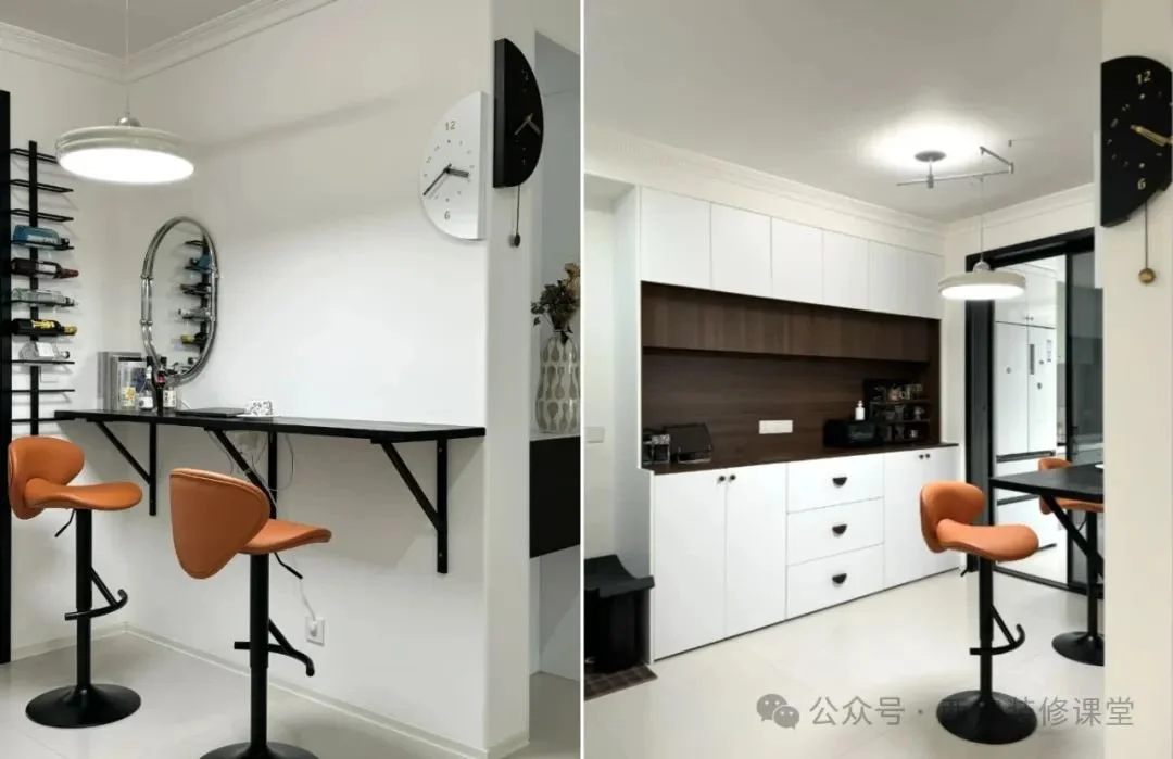 小空间户型,完全多余用餐桌,采用斗柜加吧台的形式,不仅满足了更多收纳,同时满足就餐,而且解决了平时在家办公的问题第五、装修新房必须要鞋柜吗?![]()