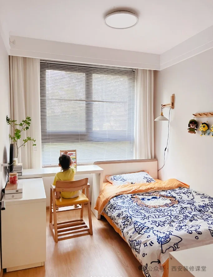 小卧室儿童房,床头靠窗,半包围设计,书桌书柜都有了,空间变大了,孩子也住得舒适了。你如果还是传统观念或者讲自己的风水,床居中放,不仅实现不了功能,孩子住着也憋屈,也就是你的思维模式决定了孩子的成长环境![]()
