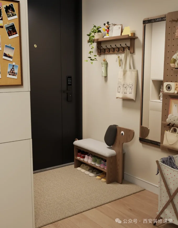 小空间的家,门口做鞋柜太显压抑,采用成品的换鞋凳满足功能也可以,而且满足进门挂衣服包包的空间![]()