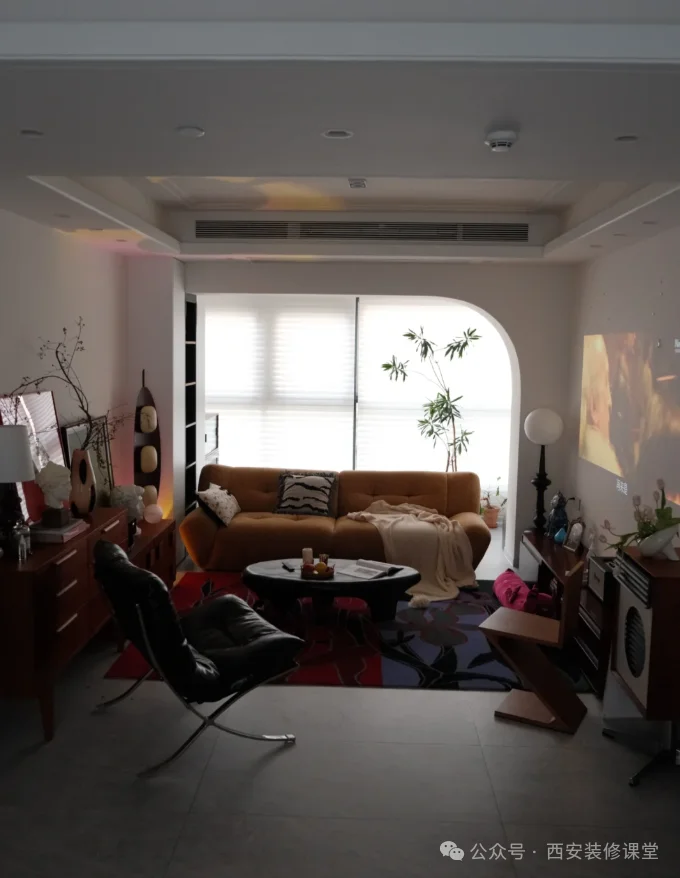 同样有电视墙,谁说沙发必须对着电视墙放呢?平时就是偶尔看个电视,多半都是客厅休闲空间,靠窗布局,空间更大,而且不论是阅读也好,休闲也好,视觉都可以更加开阔![]()