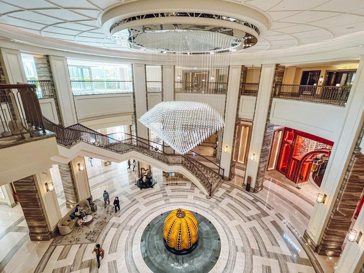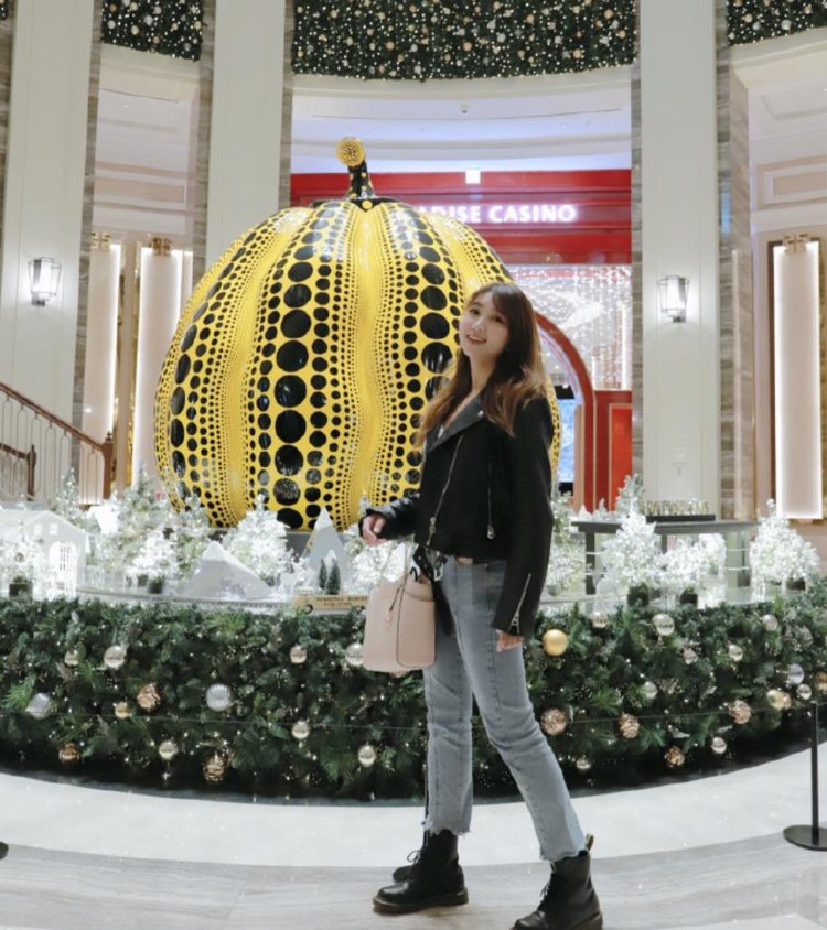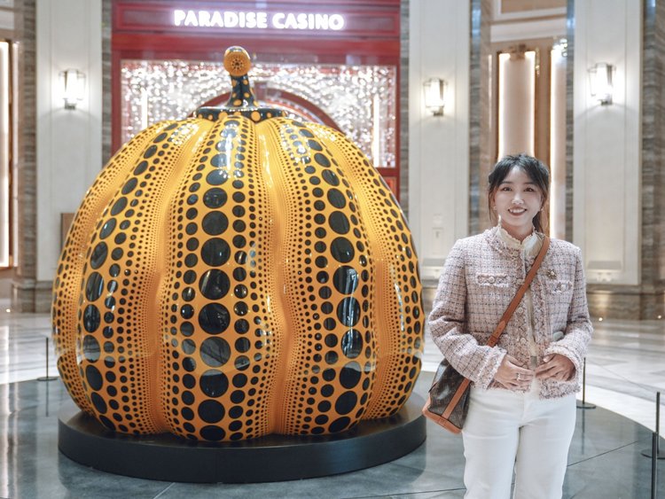 大堂中央是我超喜欢的草间弥生(Kusama Yayoi)《金黄南瓜 Great Giant Pumpkin》,2019年的合影来对比一下,我好像胖了一圈哈哈。