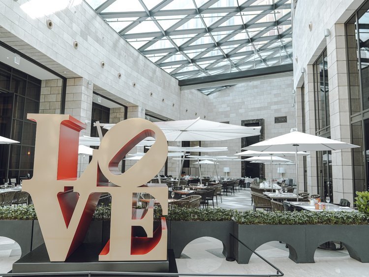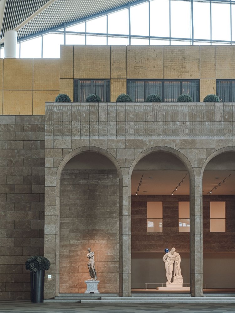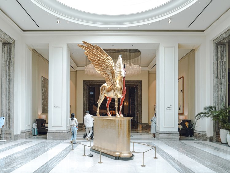 酒店内的每一处设计都有巧思,因为它本身就是一件艺术品。长达120米的三个楼翼设计是它的标志,从进入酒店大堂的那一瞬间开始,大堂中央就是达明•赫斯特 (Damien Hirst)的《Golden Legend》,金色飞马奢华优雅,我们的艺术盛宴也就此拉开了序幕。