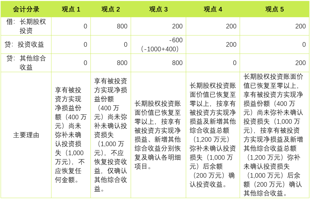 一种观点(观点1)认为,以权益法属于“计量基础”的特征为理论基础,即对资产的确认和计量均以零为限。因被投资单位所有者权益增加额小于前期未确认投资损失,长期股权投资账面价值尚未恢复至零以上,投资方不应确认被投资单位所有者权益的内部变动。