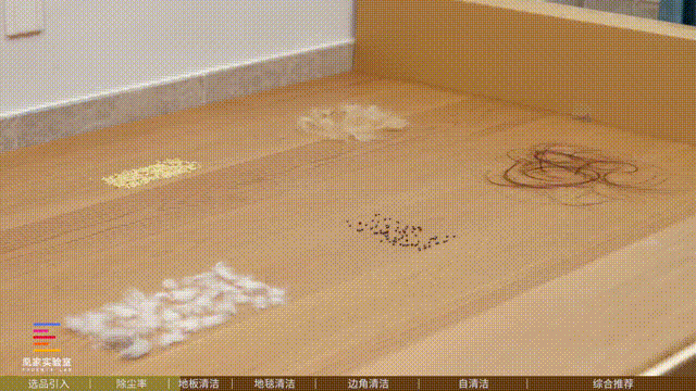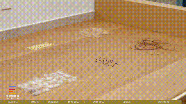 地板清洁环节,我们设置了干脆面残渣、狗毛、猫毛、头发以及活性炭颗粒,这些容易缠绕和打飞的污渍。