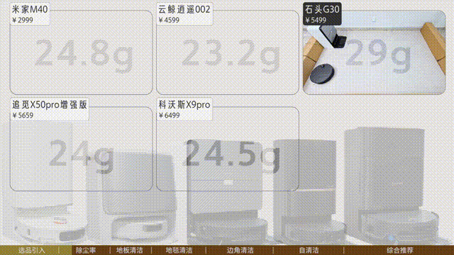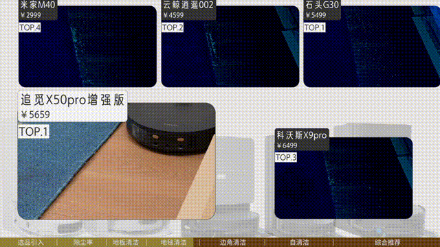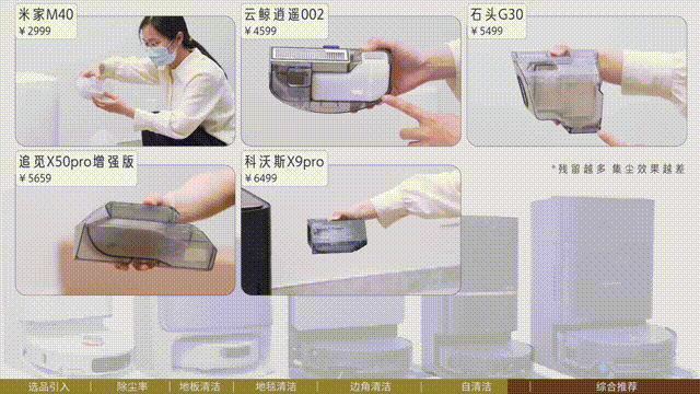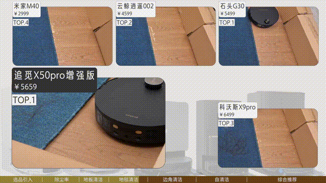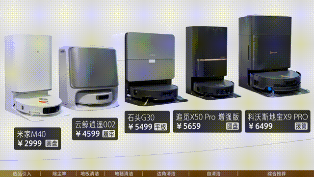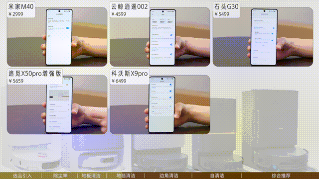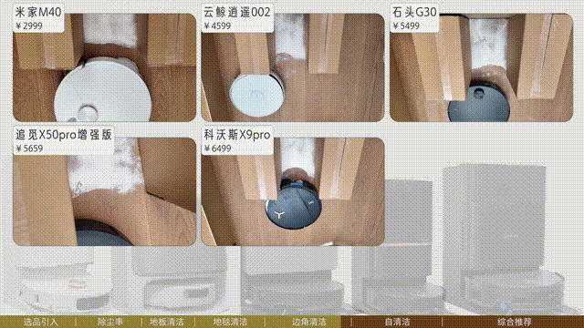 好了,话不多说,让我们再来回顾下五位参赛选手。价格从低到高分别是米家M40、云鲸逍遥002、石头G30、追觅X50Pro增强版、科沃斯X9Pro。这也是截止到我们测试开始前,各品牌的旗舰款产品。