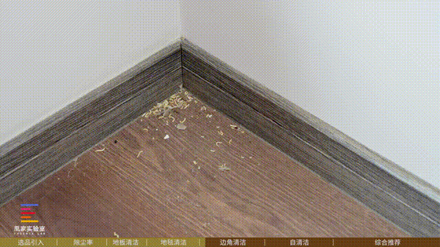 内折角是家里最常见的边角,在这个环节,依旧是石头表现最好,它在接触到边角后会弹出边刷,深入缝隙清扫。然后是米家和追觅,也能够弹出边刷清扫,但地面会残留一些粉末,需要多次清扫。最后是云鲸和科沃斯,它们都是吃了边刷无法弹出的亏,折角处始终有一小块区域无法触及到,时间一长就会形成卫生死角。