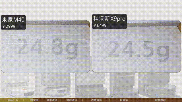 结果如下:石头以绝对优势领先,基本能把30g粉尘全部清理干净;米家、科沃斯、追觅都在24~25g之间;云鲸垫底,收集了23.2g。