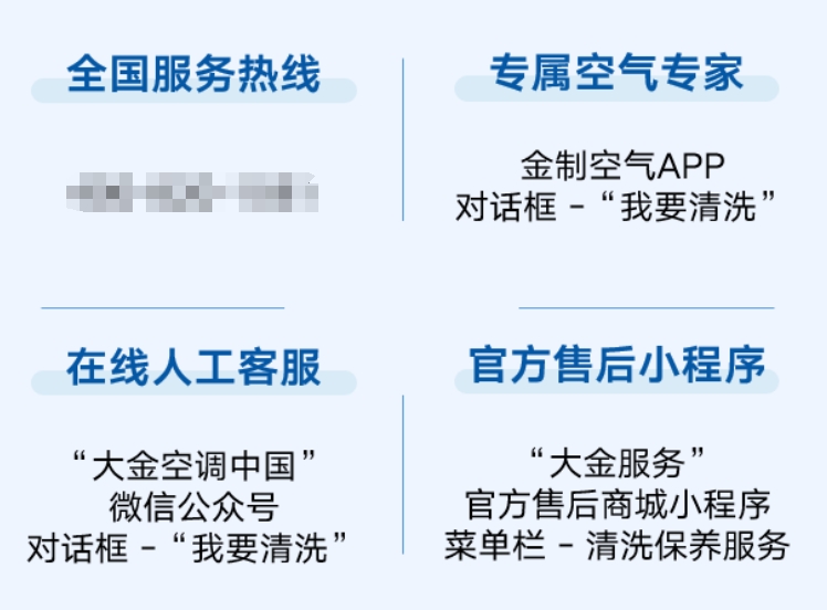 那么,消费者在哪里能找到正规清洗服务?目前,空调清洗市场鱼龙混杂,很多消费者可能会被铺天盖地的虚假广告误导,甚至可能因选择无专业清洗资质的机构而遭遇误操作,导致机器受损,造成不必要的损失。对此,大金提醒有清洗保养需求的广大消费者,可通过拨打官方电话,金制空气 APP、“大金空调中国”官方微信公众号以及“大金服务”官方售后商城小程序等官方途径进行预约清洗保养服务。