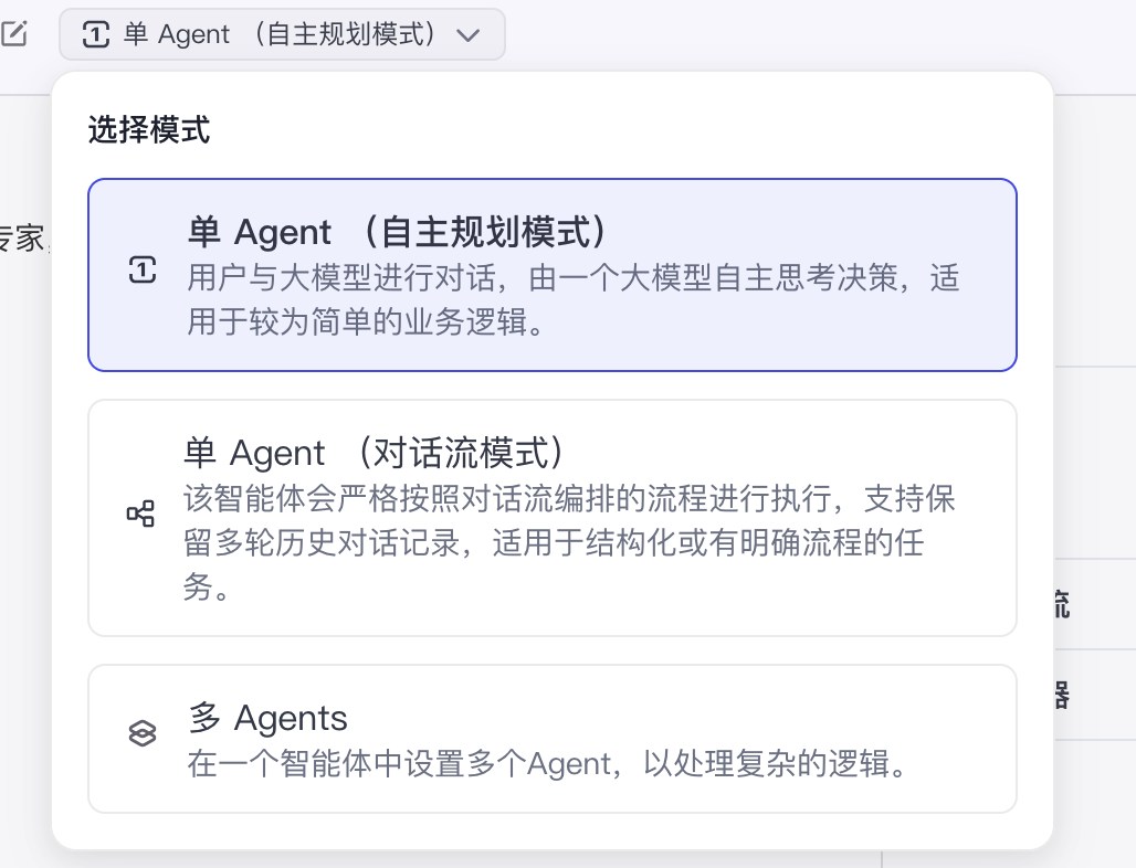 运行模式支持“单Agent(LLM模式)”、“单Agent(工作流模式)”、“多Agents”,按官方说法“单Agent(LLM模式)”和“单Agent(工作流模式)”是适合处理简单逻辑,“多Agents”适合处理复杂逻辑。