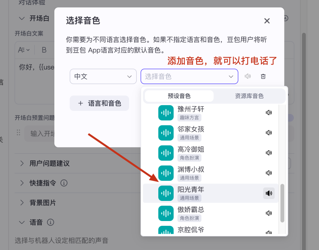 在角色--语音,增加语音功能,让智能体直接语音聊天。