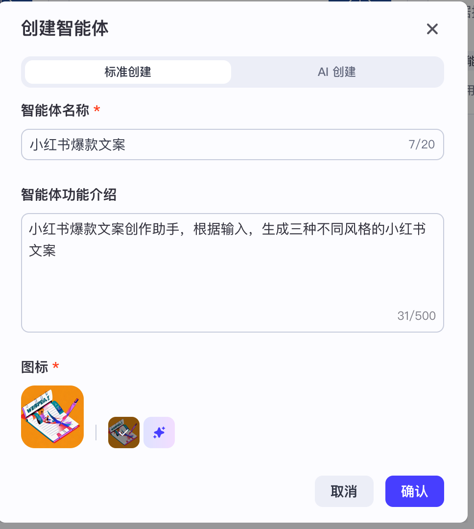 按要求填写智能体信息,图标可以通过AI自动生成,也可以本地上传图片,填写完成后,点击“确认”按钮。
