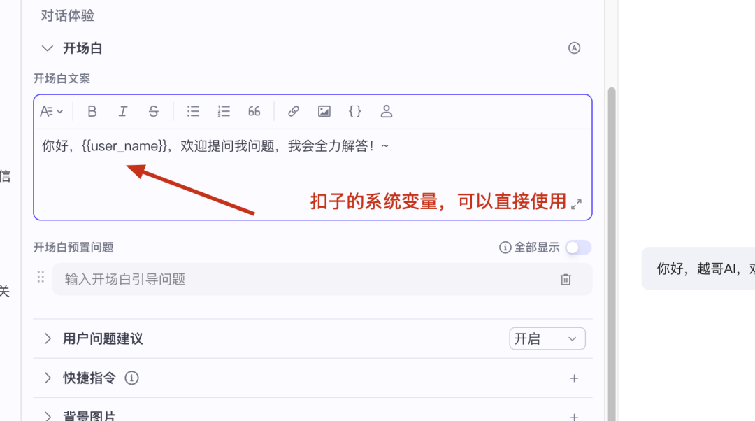 给智能体添加开场白,这样用户体验更好。开场白支持插入图片、链接,设定文本格式等,按自己需求调整。