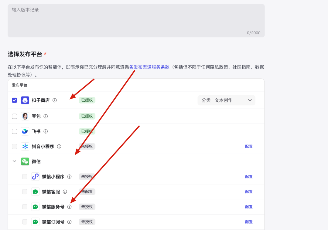 发布时填写发布记录(非强制),选择发布平台,默认是“扣子智能体商店”,勾选完成后,点击右上角的“发布”按钮。