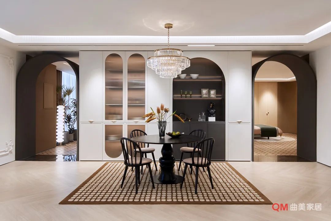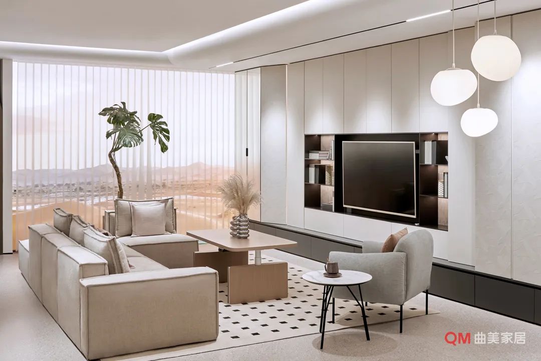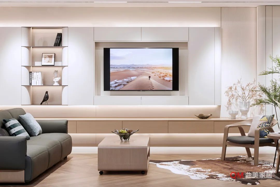 装修密码: 微弧形设计与圆润边角构成温柔主线,舍弃浮夸主灯,无主灯设计搭配点式光源释放温馨光晕。