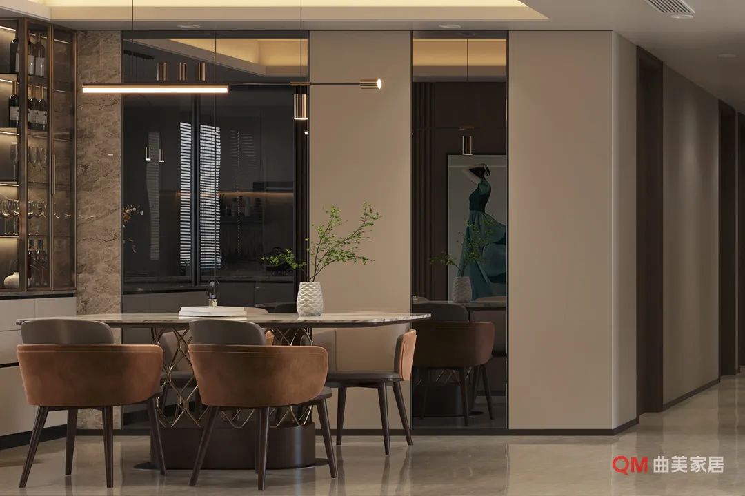 空间要素: 实木格栅隔断自然界定功能区,景深艺术小品营造一步一景,留白艺术墙成为现代书画作品最佳舞台。