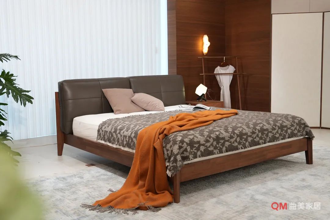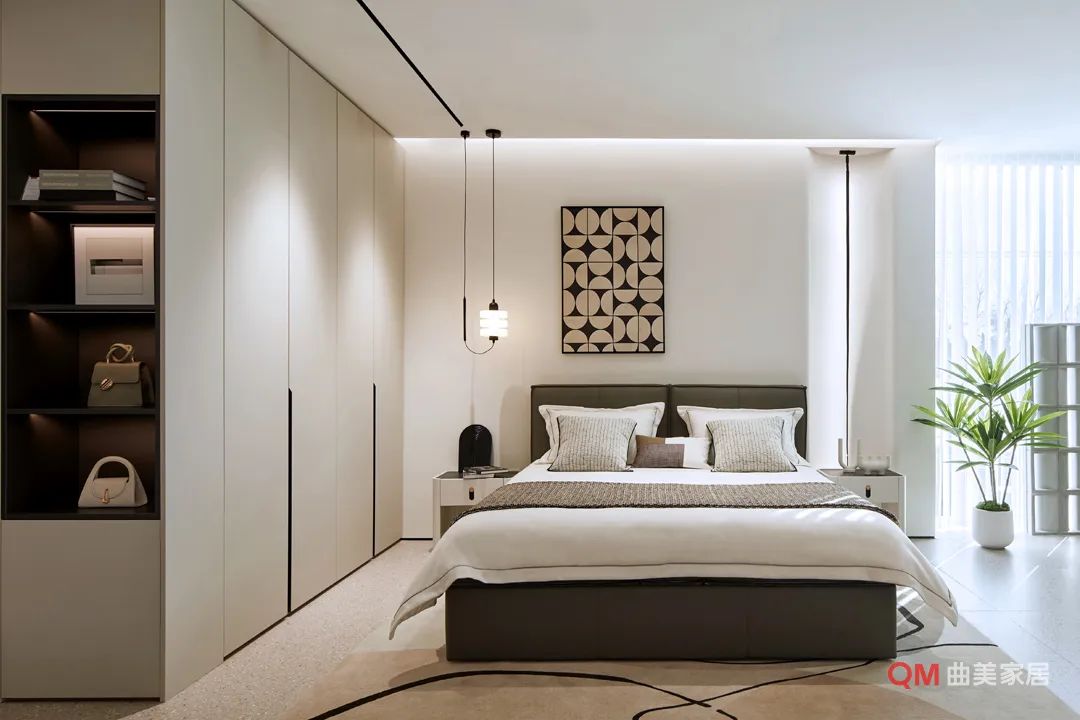 床: 低矮悬浮感造型,饱满柔软的床头软包是关键。配色以主色系为主,点缀同明度、饱和度适中的自然调跳色(如绿、暖橙)。