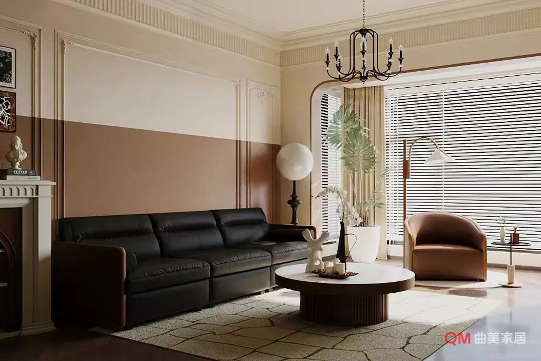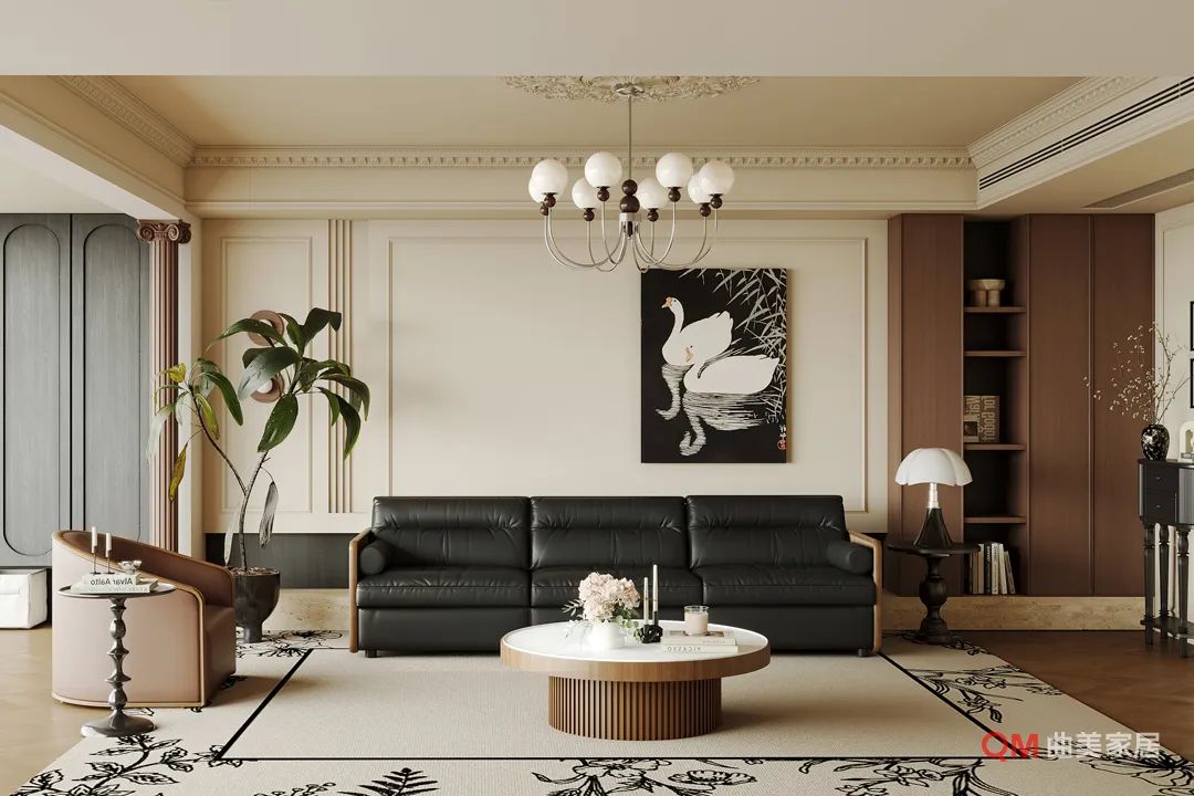 灵魂单品: 真皮组合沙发奠定空间气场,全铜枝形吊灯提升艺术气质,大尺度抽象油画注入现代艺术基因。