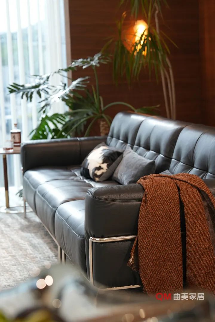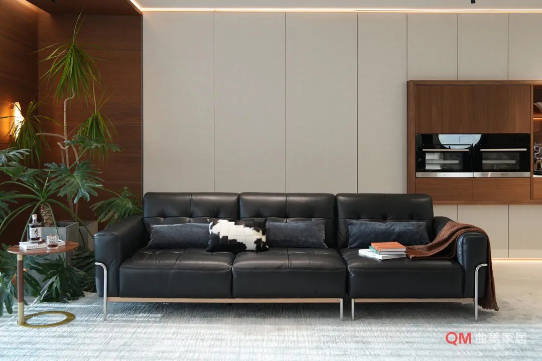 沙发:精炼几何形态的组合沙发,强调哑光/细腻皮料或高档素色布艺。