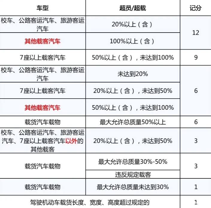 根据我国的相关规定,超员/超载的扣分行为共有7种,包括扣12分、扣9分、扣6分等。其中,扣12分包括:超员/超载在20%以上(包括20%)的车辆有校车、公路客运汽车、旅游客运汽车;超员/超载在100%以上(包括100%)的车辆是所有的载客汽车。