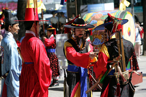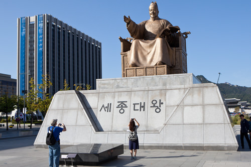光化门广场是首尔的象征性门面,了解韩国先从两位伟人开始,那就是高高大大伫立在这里的两座铜像——李舜臣将军和世宗大王。在这里拍照也算是来首尔旅游过的象征性纪念照了。广场上还有可以免费试穿韩服的地方,穿上王、王后的服装,来张异国穿越照吧!