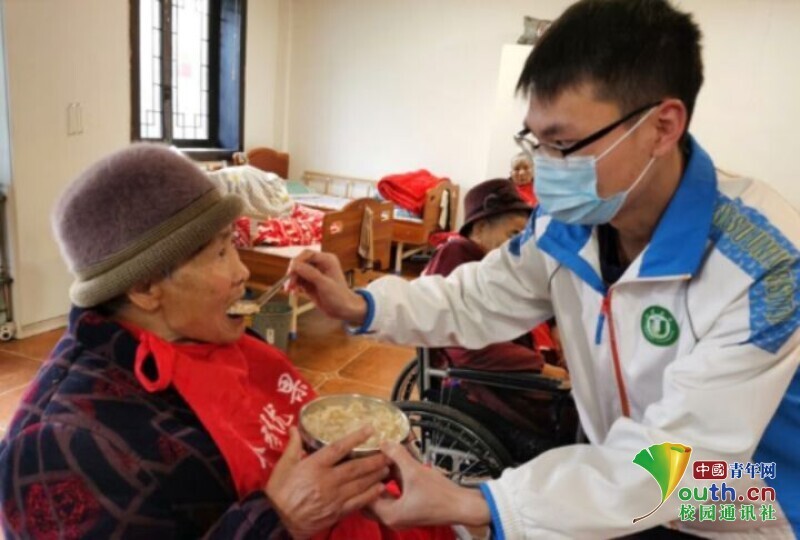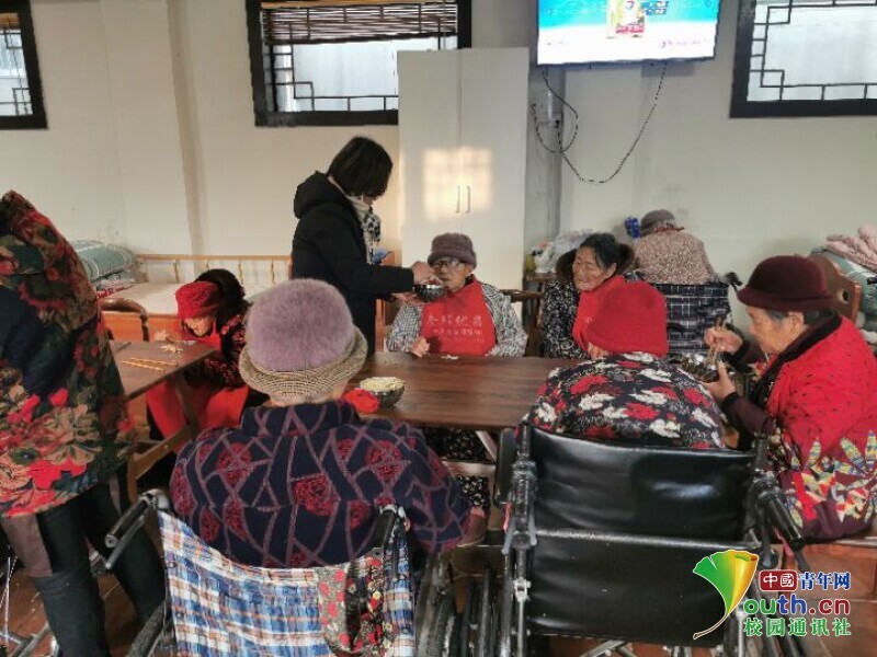 ??图为实践团的成员给老人们喂饭。中国青年网通讯员陆双倩摄。