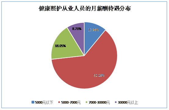 5.【月收入水平分布】目前89.04%的健康照护从业人员的实际月薪酬待遇超过5000元,特别是北上广等大城市金牌月嫂等岗位的月收入过万。具体分布为:5000元以下占比10.96%,5000-7000元占比62.28%,7000-10000元占比18.05%,10000元以上占比8.71%。