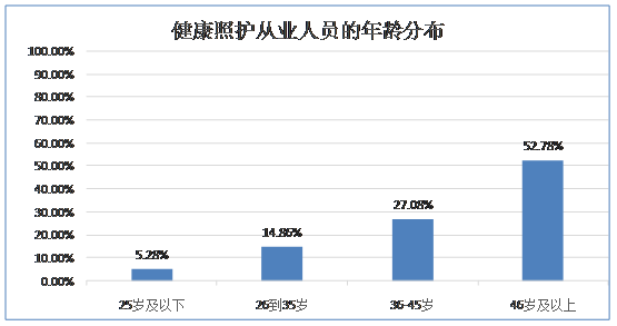 1.【年龄分布】25岁及以下占比5.28%,26-35岁占比14.86%,36-45岁占比27.08%,46岁以上占比最高,为52.78%。说明各个年龄段都有从业者,健康照护职业不仅是新人进入职场的选择,更是个人职业发展转型的重要途径。当前这个阶段4050人员占近一半比例,但随着对新职业认同感的提高,未来从业人群会逐步年轻化。