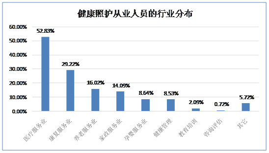 2.【行业分布】目前健康照护工作者分布在多个行业中,排前四位的分别是医疗服务业、康复服务业、养老服务业、家政服务业,另外在孕婴服务业和健康管理等行业也有较多从业者。