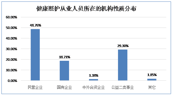 6.【机构性质分布】48.76%的健康照护从业人员在民营企业工作,29.3%在公益二类事业单位,18.71%在国有企业工作,1.38%的在中外合资企业,其他类型的机构有1.85%,因此可见各种性质的照护机构都有健康照护师的需求。