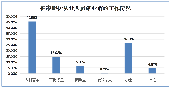 7.【解决就业情况】从事健康照护工作前的就业情况分别是,45.9%是农村富余劳动力,26.97%是护士转岗或兼任,15.02%的是城镇下岗职工(无业或灵活就业),6.66%的是初中和高中毕业之后未升学的人群(两后生),0.61%的是复转军人,其他占4.84%,主要包括康复护理师、大学毕业生等。健康照护师的就业范围广,广大农村富余劳动力、城镇下岗职工、初高中毕业后没升学的人群经过培训,都可以上岗就业。护士因具备医疗照护知识技能,很容易转岗成为健康照护师,这一新职业能解决大量就业问题。