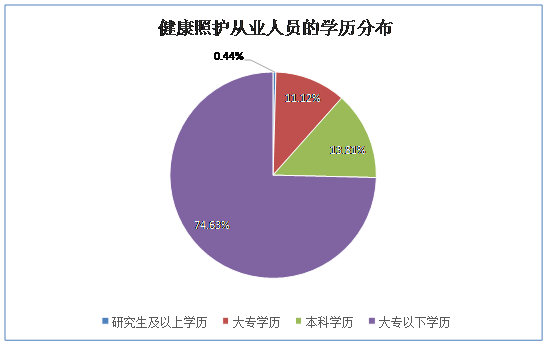 4.【学历分布】关于健康照护工作者的学历,74.63%为大专(不含)以下,11.12%为大专学历,13.81%为本科学历,0.44%为硕士研究生。目前,健康照护从业人员就业门槛较低,随着未来对健康照护师职业认可度的提高,会有越来越多高学历的年轻人加入健康照护师队伍,从而提高健康照护从业人员的整体水平。