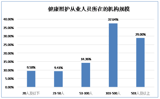 3.【所在机构规模】20人及以下占比9.58%,21-50人占比9.41%,51-100人占比14.36%,101-500人占比37.64%,501人及以上占比29%。大、中、小、微型照护服务机构都需要健康照护工作者,借此为机构提升服务水平和市场竞争力,特别是大型的照护机构更愿意召募经过系统培训的健康照护师。